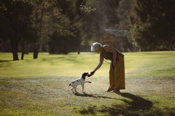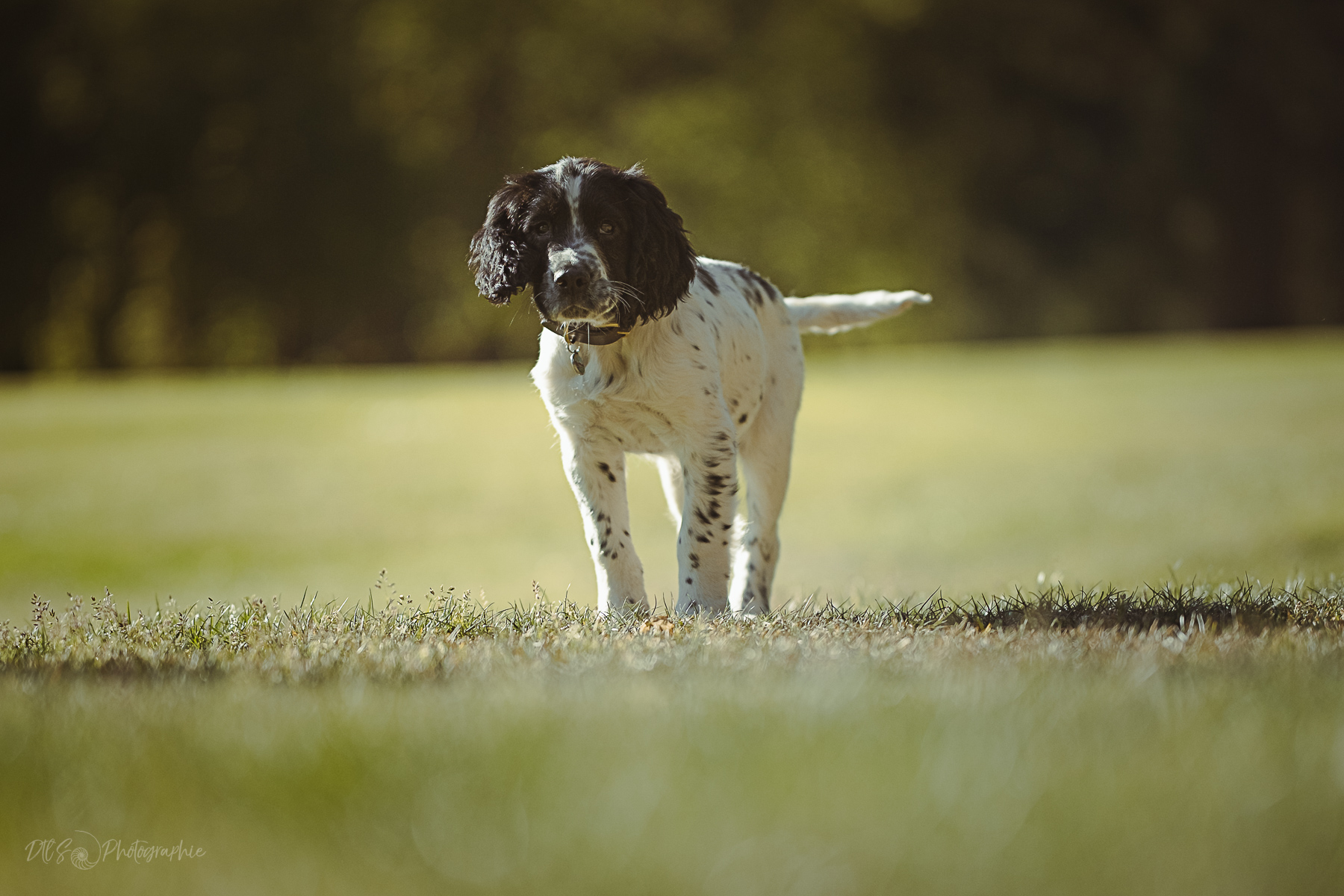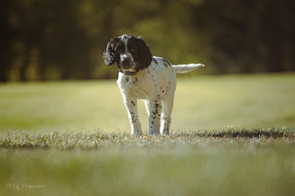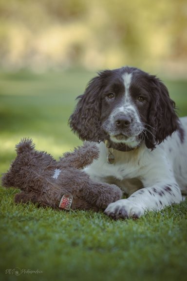 Valérie a fait appel à moi lorsqu'Alouette a déboulé au sein de leur foyer. Espiègle, joueur et affectueux, la séance chiot s'est déroulée sur son terrain de jeu favori, un endroit connu et avec son doudou pour être rassuré !